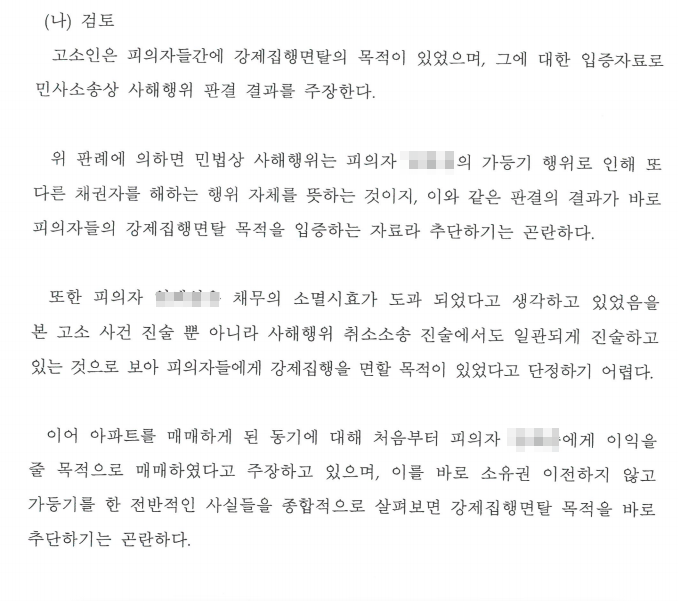위와 같은 상황을 듣고, 본 변호인은 앞서 말씀드린 구성요건 하나하나를 쪼개어 보며 의뢰인들의 행위가 강제집행면탈죄에 해당하지 않는다는 근거를 찾기 시작하였고, 검토 끝에 의뢰인 ① 의뢰인 1은 실제로 의뢰인 2에게 채무를 부담하고 있었고, ② 담보가등기와 달리 순위보전을 위한 가등기를 한 것만으로는 채권자를 해하는 것이 아니며, ③ 설령 위와 같은 사정이 인정된다고 하더라도 의뢰인들에게는 강제집행을 면할 목적이 없었다는 점 등 한 가지 사유가 아니라 사건을 입체적으로 보아 여러 방면에서 의뢰인들의 행위는 강제집행면탈행위에 해당하지 않음을 주장하였습니다.