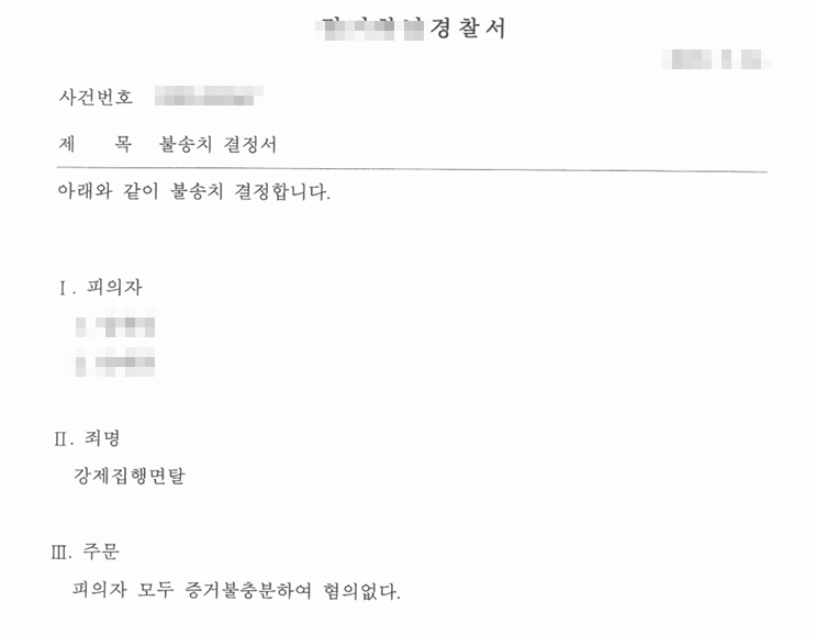 이에 수사기관에서는 ① 의뢰인 1이 망인에 대한 채무가 소멸시효 기간 도과로 소멸한 것으로 알고 있었을 가능성이 농후하고, ② 의뢰인 1과 의뢰인 2의 관계 및 의뢰인 1이 부동산을 구매하게 된 경위와 의뢰인 2에게 가등기를 경료해준 경위 등을 고려해서 의뢰인들에게 강제집행을 면탈할 목적이 없었다는 이유로 불송치 결정을 하였습니다.