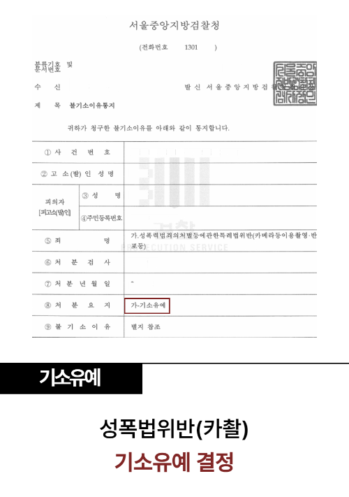 결국 의뢰인은 성폭법위반(카촬) 범죄에 대하여 기소유예 결정을 받을 수 있었습니다.